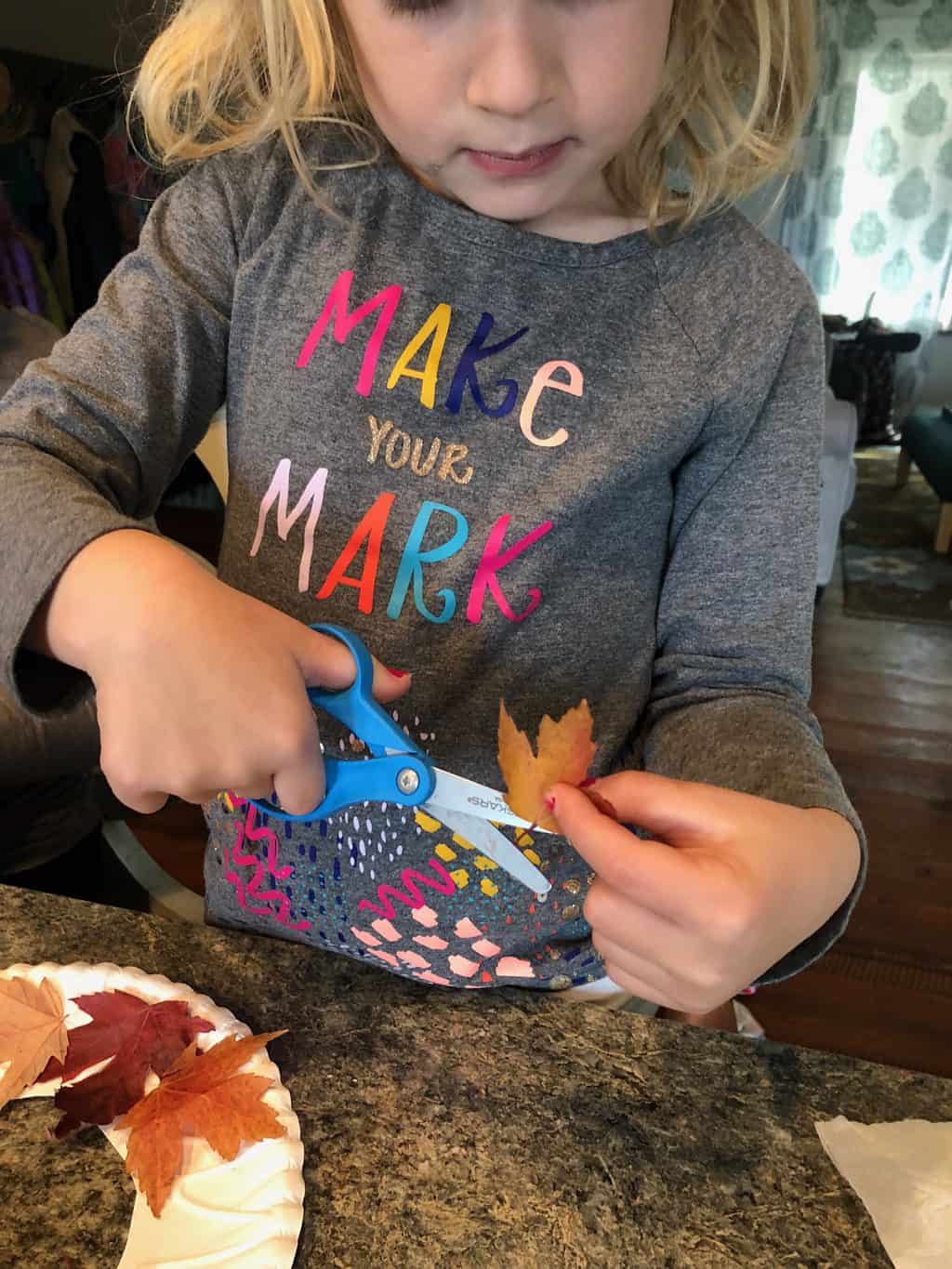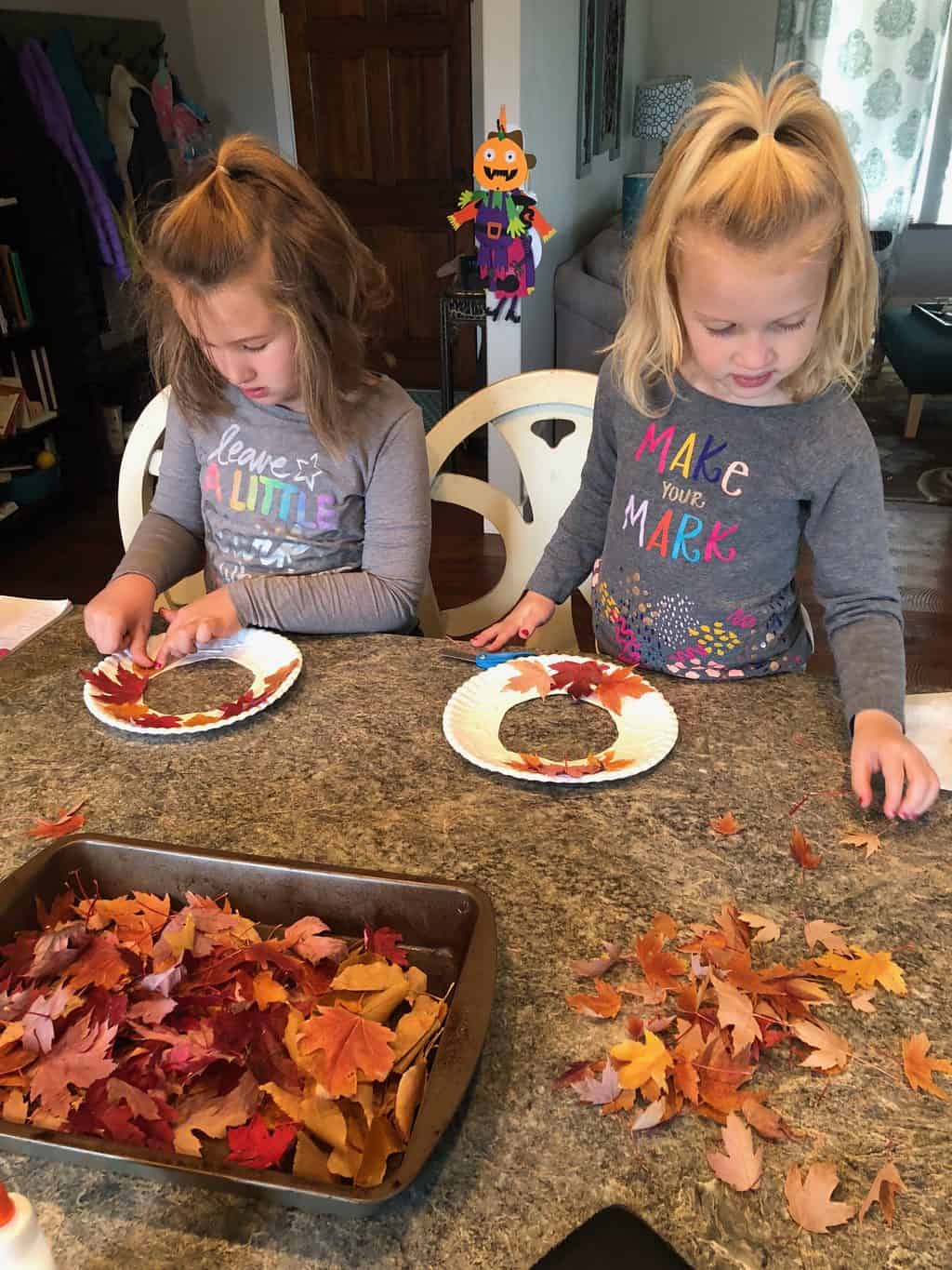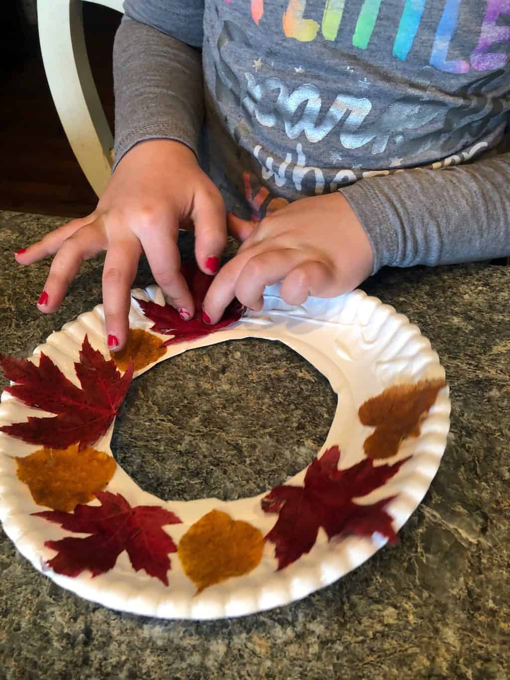 I bought cheap paper plates for crafts in bulk a couple of years ago, and I still have at least half of them left. I am always looking for ways to incorporate them, and they were perfect for our little Leaf Wreaths.